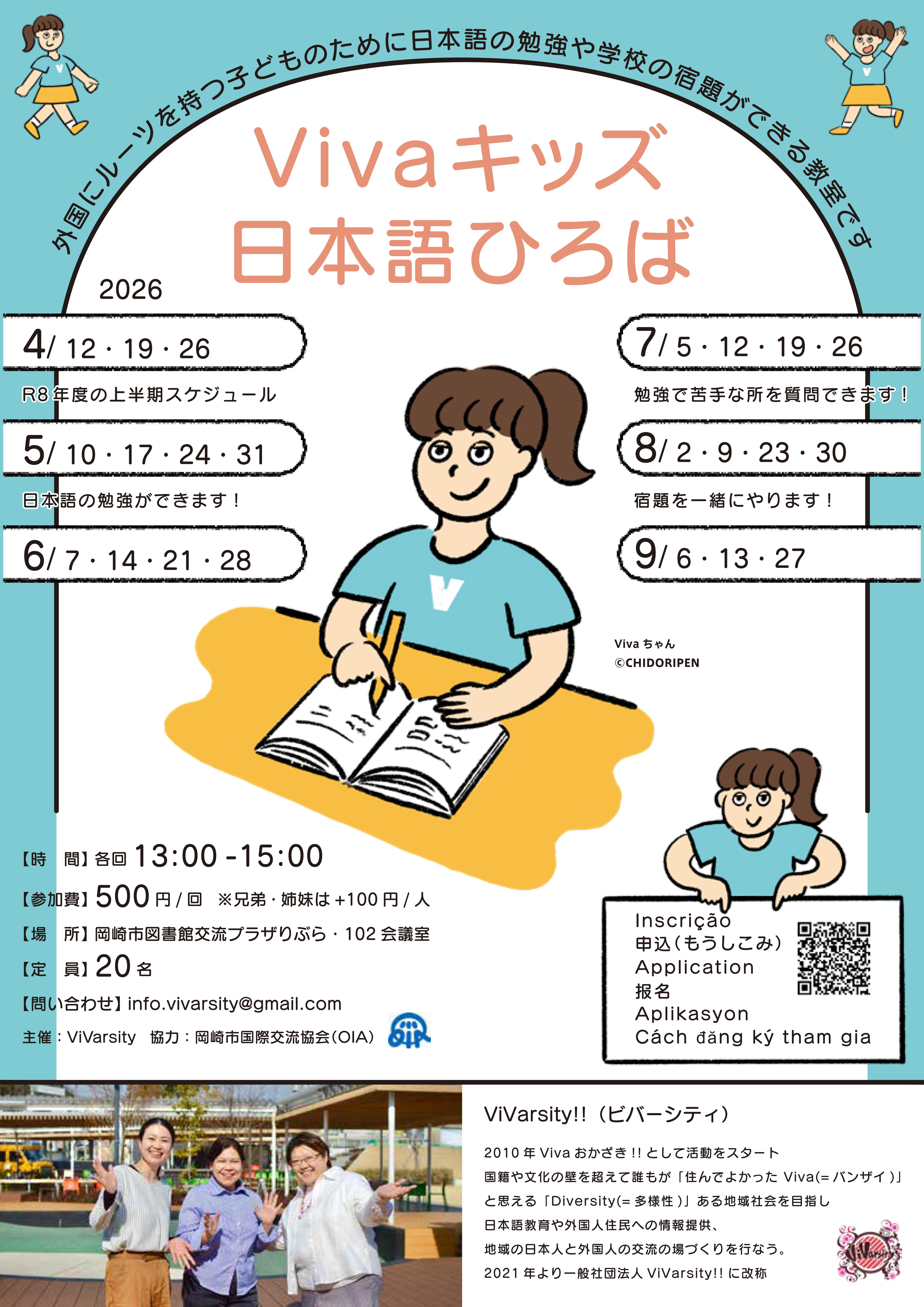 外国にルーツを持つ子どもたちのために 日本語や学校の勉強をする教室です。 日にち:毎週(まいしゅう)日曜日(にちようび) ※2026年4月5日、5月3日、6月1日、8月16日、9月20日はお休みです。 時 間:13:00〜15:00 場 所:岡崎市図書館交流プラザ 1階102会議室 参加費:500円/回(兄弟+100円) 申し込み:https://forms.gle/MKzaJNJPajANcHty9 問い合わせ: に件名に『Vivaキッズ』、本文に@名前、A国籍、B電話番号を書いてメールください。 notice We are unable to accept new participant applications due to full enrollment. 人数(にんずう)がいっぱいなので、新(あた)しく参加者(さんかしゃ)の申込(もうしこ)みはできません。 Como a cota de inscricoes ja foi coberta, nao serao aceitas inscricoes de novos alunos. |
